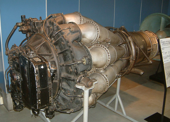 The Derwent Mk.I entered production with 2,000 lbf (8.9 kN) of thrust. Mk.II, III and IV's followed, peaking at 2,400 lbf (10.7 kN) of thrust. The Derwent was the primary engine of all the early Meteors with the exception of the small number of Welland-equipped models which were quickly removed from service. The Mk.II was also modified with a cropped impeller (turbine unchanged)[4] and a reduction gearbox driving a five-bladed propeller. It was called the Rolls-Royce RB.50 Trent and was the first turboprop to fly. Two were installed in a Meteor I.