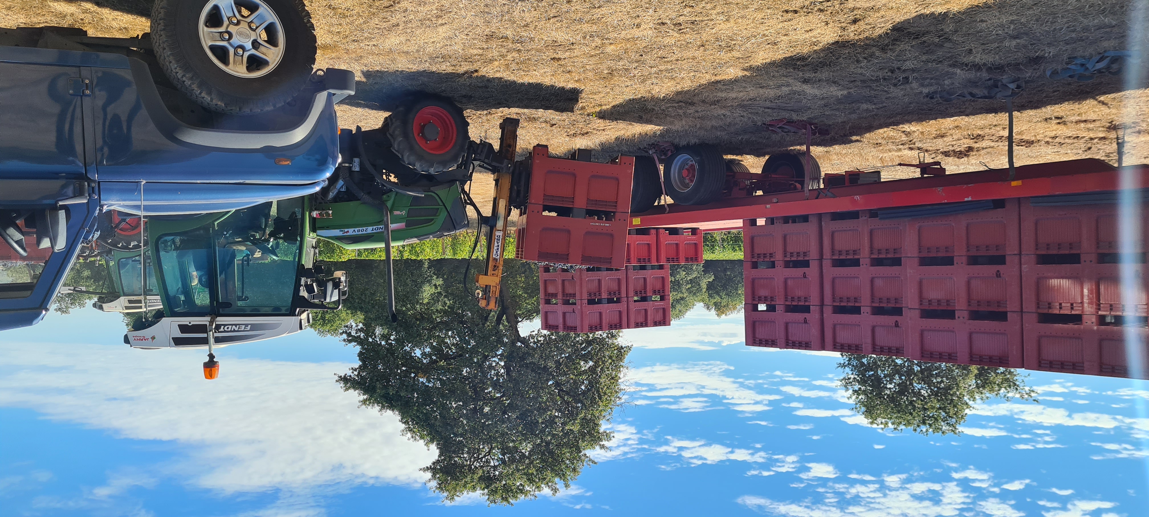 Once the shoulder bins are full the harvester reverses up to a waiting trailer and hydraulic jacks then push up the bins and empty the beautiful grapes and juice into the trailer that is then carried off to the winery.